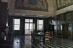 In the background, the wall of the ceremonial hall, decorated "with four paintings of the Dutch school," can be discerned in the gloom.[39][40] It is known that Peter the Great imported a number of Dutch paintings from abroad for the decoration of the Monplaisir. Among these, the works of the painter and engraver Adam Silo occupied a special place. The paintings were displayed in the palace's ceremonial hall and other rooms, which were regarded as "the first picture gallery in Russia".[109]