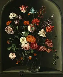 An important portion of van Kessel's output is constituted by floral still lifes. An example is the Floral still life in a niche with a stag beetle (at Hampel Munich sale of 30 March 2017 lot 263<) which shows flowers in a glass vase set in a stone gray niche. The flowers do not reach outside of the niche. The glass vase stands at the very edge of the niche. A stag beetle is about to climb the wall recess and unto to the ledge on which the vase stands. The painter has arranged the flower container in the vase in such a way that all flowers, including roses, tulips, carnations, marigolds and other garden flowers are equally lit up in front of the dark niche wall. Probably as a vanitas reminder (discussed below), the stems or petals of the hollyhock on the right and the nasturtium on the left are shown already drooping slightly.[7] This type of painting is very reminiscent of the still life in a niche paintings of earlier Flemish artists such as Osias Beert.[8]