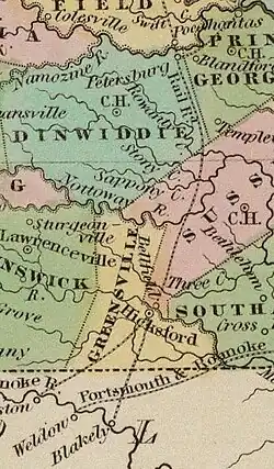 In 1857, stations were located at Stony Creek, Jarratt's, Belfield, Hicksborough, Pleasant Hill, Garysburg, and Weldon.[6]