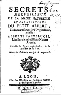 Petit Albert (English: Small Albert) is an 18th-century grimoire of natural and cabalistic magic.[4][5] It may have been inspired by the writings of Albertus Parvus Lucius (the Lesser Albert).[6][7] Brought down to the smallest hamlets in the saddlebags of peddlers,[3] it represents publishing success, despite its association with "devil worshipers"[8]—or rather because of it. It is associated with a second work, the Grand Albert. It is a composite, heterogeneous work, collecting texts written by various authors; most of these authors are anonymous but some are notable such as Cardano and Paracelsus. Due to its historical nature, Albertus Magnus' attribution to the text is considerably uncertain and since the text quotes from many later sources, it is an ethnological document of the first order.