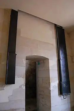 The ground floor, known in the 18th century as 'the underground passageways', is accessed via a vestibule with two doors opening onto a modest porch in the entrance courtyard to the south of the château. To the left is the guards' room and to the right is the billiard room, with the rest reserved for household use.[59] Before the restoration work was completed in 2008, this floor was used to receive the public and provide services, and has now been returned to its original purpose; the entrance is via the Swiss house,[67] as it was in the old days.