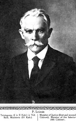 Petras Leonas (1864–1938) was a Lithuanian attorney and politician, the first Minister of Justice of the newly independent Lithuania in 1918.