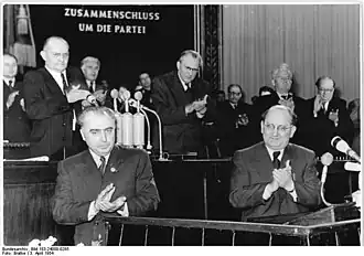In 1956, he was, alongside Gheorghiu-Dej, Miron Constantinescu, and Iosif Chișinevschi, one of Romania's delegates to the famous 20th Congress of the Soviet Communist Party, where, to their surprise, Nikita Khrushchev condemned Joseph Stalin and announced a path to De-Stalinization.[7] As a consequence of this move, Gheorghiu-Dej made a claim to have De-Stalinized the PCR years before Khrushchev, and linked Stalinism exclusively to the fallen Pauker-Luca faction: Petre Borilă played a significant part in this process, rallying with the Romanian leader as the latter purged the PMR of members who advocated increased liberalization.[8] Later in the same year, together with Gheorghiu-Dej, Vincze, Constantin Pîrvulescu, and Alexandru Moghioroș, he engaged in talks with Pauker, who was by then released from detention and placed under close Securitate surveillance — they attempted to have her confess to political crimes, but she defiantly continued to deny the bulk of the charges.[9]