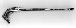 The sclopus was the prototype of the petronel. The petronel is a compromise between the harquebus and the pistol.[2] Early petronels date back to the end of the 14th century, with a crude buttstock. Generally the touch hole is on the right side, and fired by a separate slow match.[3] Sometimes petronels had small hinged plate-covers to protect the priming from moisture.[4] By extension, the term "petronel" came to characterise the type of light cavalry which employed the firearm. The petronel (cavalryman) was used to support the heavy cavalry such as demi-lancers and cuirassiers. The petronel was succeeded by a similarly armed cavalryman called the harquebusier.