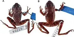 - ^ a b Sánchez-Vialas, Alberto; Calvo-Revuelta, Marta; Castroviejo-Fisher, Santiago & De la Riva, Ignacio (2018). "The taxonomic status of Petropedetes newtonii (Amphibia, Anura, Petropedetidae)". ZooKeys (765): 59–78. doi:10.3897/zookeys.765.24764. PMC 5999683. PMID 29904270.