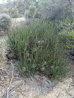 Petrophile aspera is a shrub that typically grows to a height of 0.2–0.5 m (7.9 in – 1 ft 7.7 in) and has glabrous branchlets and leaves. The leaves are cylindrical, 110–300 mm (4.3–11.8 in) long and 1.5–2 mm (0.059–0.079 in) wide, often curled at the tip. The flowers are arranged on the ends of branchlets in sessile, oval heads up to 30 mm (1.2 in) long, with linear to lance-shaped involucral bracts at the base. The flowers are about 20 mm (0.79 in) long, sweetly scented, pale pink to pale yellow or white. Flowering occurs from August to November and the fruit is a nut, fused with others in a more or less elliptical head up to 25 mm (0.98 in) long.[2][3][4]