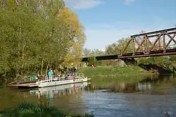 One curiosity in Pettstadt is the Pettstadter Schmied, Upper Franconia’s only reaction ferry, which crosses the Regnitz not far west of the village and is used mainly by cyclists. The original Pettstadter Schmied (German for “Pettstadt smith”) is the main character in a story that is well known throughout the region. It tells of master smith Sebastian Schubert, who died in 1910. About the turn of the 20th century, it is said that, at a very late hour at an inn, he would not comply with a gendarmerie patrol’s order to leave the inn. Instead, he said “Des mach ich, wie ich mooch” (dialectal German for “I do whatever I like”). The incident led to charges. The judge at the Royal Bavarian Amt Court, however, acquitted the accused citing an apparent lack of abusive or rebellious attitude. From this developed a well known Upper Franconian expression: Mach' es wie der Pettstadter Schmied (“Do it like the Pettstadt smith”), which is taken as a demand to decide on one’s own authority.[4]