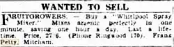 Frank Petty probably conceived the idea for a steerable plough, although the source of his inspiration is unknown. He invented many useful objects for use on his orchard. He developed and marketed the 'Whirlpool Spray Mix' a device not unlike a giant eggbeater which clamped to the inside of a drum of fruit spray, with a handle which when turned was designed to mix the spray.[5]
