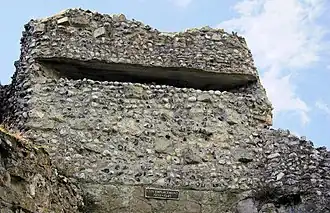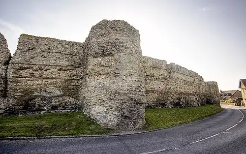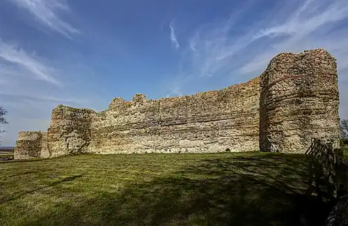 The castle's curtain wall is built on a massive scale, with ramparts and projecting towers still standing up to 8.2 metres (27 ft) high (and probably about 9.5 metres (31 ft) high when built) and 4.2 metres (14 ft) thick at the base.[9] The north, east and west sections of the curtain wall have survived mostly intact, with the exception of one fallen segment of the north wall; the south wall, which would have adjoined sea or marsh, has almost entirely disappeared.[10] It is faced with ironstone and sandstone, though most of the original facing stones have been robbed out over the centuries; the structure visible now consists mostly of the rubble and sandstone core, bound together with mortar. Bonding courses of tiles run horizontally through the wall.[7] An impression of its original appearance can be gleaned from an area in the north wall which has been excavated down to the still-intact foundations, revealing how it was once faced on both sides with small blocks of stone.[11] The wall originally had a stepped appearance with at least two levels of steps on the interior face, though there is no surviving indication of how the garrison reached the top.[5] At the top of the wall the remains of medieval crenellations can still be seen, which probably replaced Roman originals.[7]