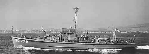 - US Navy submarine chaser that had a displacement of 148 tons, a length of 110 feet, a beam 17 feet, a draft of 6 feet top speed of 21 knots. A crew of 28. Armed with: one 40mm gun, two .50 cal. machine guns, two depth charge projector "K Gun," and two depth charge tracks. Powered with two 1,540bhp General Motors (Electro-Motive Div.) 16-184A diesel engines to two shafts.[9][10]