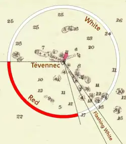 The Tévennec light was first activated in 1875.[8] It is an early example of a Sector light, with different characteristics (Red/White or flashing rates) indicating safe approach bearings.