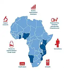 The PharmAccess Group employs an integrated approach in order to improve access to quality health care.[8] The group mobilizes public and private resources for the benefit of doctors and patients through insurance, loans to doctors, clinical standards and impact research. The PharmAccess Group state they have a different approach to development cooperation, by making use of public-private partnerships. PharmAccess works with various different African and international partners, donors and investors from both the private and the public sector.[9]
