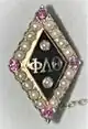 The Phi Lambda Theta badge was diamond-shaped, with a black enamel center that featured the Greek letters ΦΛΘ, with a pearl above and below.[1] Its pledge button was the shield of Penn State in blue and white.[1]