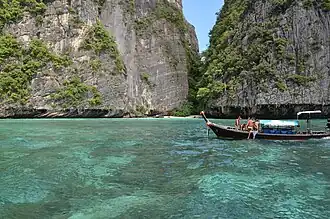 In June 2018, Maya Beach, made famous by Leonardo DiCaprio's 2000 film The Beach, was closed indefinitely to allow it to recover. The beach used to receive up to 5,000 tourists and 200 boats a day.[8] It reopened January 1, 2022.[15]