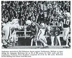 As an athlete in high school, Robertson was all-state in football, baseball, and track, which afforded him the opportunity to attend Louisiana Tech in Ruston on a football scholarship in the late 1960s.[12] At Tech, he played first-string quarterback for the Bulldogs, ahead of Pro Football Hall of Famer Terry Bradshaw,[13][14] the first overall pick in the 1970 NFL draft. When he arrived at Tech in 1966, Bradshaw caused a media frenzy on account of his reputation of being a football sensation from nearby Shreveport.[15][16] Robertson was a year ahead of Bradshaw, and was the starter for two seasons in 1966 and 1967, and chose not to play in 1968.[17]