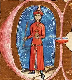 Pope Nicholas III appointed Philip as papal legate with "full jurisdiction" (legationis officio plene) to Hungary and its adjacent territories, Poland, Dalmatia, Croatia, Bosnia, Serbia, Galicia–Volhynia and Cumania ("ac Polonie, Dalmatie, Croatie, Rame, Servie, Lodomirie, Galitie et Cumanie partibus illi conterminis") on 22 September 1278.[4] Despite Philip was not a member of the College of Cardinals, he was granted the rank legatus a latere,[10] consequently he was the "alter ego" of the pope and thus possessed full plenipotentiary powers.[11] This reflects the importance that the pope attached to the legation. Even the 14th-century Illuminated Chronicle depicts the arriving Philip with a cardinal's insignia: the illustrator could not conceive of such an important legation without the legate being a cardinal.[10] As a result of his rank legatus a latere, Philip was mandated to donate church benefice; he could appoint his clergy as canons in any chapter; he was authorized to grant indulgence; he could also enforce the imposition of his measures with censure (i.e. excommunication, interdict and suspension), in addition to lifting those punishments. Immediately after his appointment, Philip became de facto head of the Catholic Church in Hungary and was able to convene and preside provincial and national synods. He also acted as the supreme appeals forum for church litigation cases.[11] The pope marked his chief duty in assisting King Ladislaus IV of Hungary to consolidate his authority and restore royal power, in addition to defend the rights and freedoms of ecclesiastical institutions against tyrannical secular lords. Philip was also instructed to strive to enforce canon law in Hungary and the neighboring countries.[12] Beyond that, one of his main tasks was to settle the situation of the Archdiocese of Esztergom, which had been sede vacante for 7 years.[11][13]