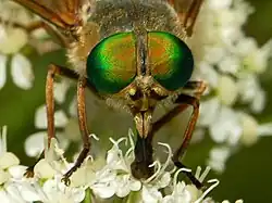 The adult females grow up to 18 millimetres (0.71 in) long. Their large compound eyes are bright green, without hairs and ocular bands. The terminal of antennae is brownish-black. The thorax is dark-brown and quite hairy. The abdomen has clearer bands at the end of each black tergite. Wings and legs are yellowish-brown. Halteres are brownish-yellow.[8][9]