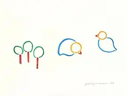 As a photographic artist, he is an intuitive conqueror of the moment.[10] "Leaves floating on water cast shadows, white women's legs dive into a pool, the heat of the Sierra Nevada flickers outside a car window, a luminous Ferris wheel vibrates."[11] All the images are united by an eye for special details and moods.[12] Keel alters reality through alienation or reduction. He captures the magical in the everyday and seeks the world behind the world. "My photography should be honest and direct like a dream, that is my claim."[13] "Signals and signs that mean something are there every day. I take great pleasure in linking the things I see and experience and putting them together anew, like a puzzle that makes sense only to me."[14] While a photograph can be created quickly, Keel's image processing in the lab often takes many months. Working with Don Weinstein, one of the most renowned photo printers in the US, and with Epson, Keel developed what he calls the ›Imbue Print‹ over a period of years.[15] His artistic work is inspired by David Hockney, Saul Steinberg, Henri Matisse, Tomi Ungerer, Irving Penn, Richard Alvedon and Saul Leiter. The art of his mother Anna Keel, who was a painter and draughtswoman, also had a strong influence on him. "I hang unfinished works on the wall and mark the places that still need work. Then I let time pass. It's never wrong to take a moment to think about what you're doing."[16] Of his watercolour work, Keel said. "What counts here is the pace (...). Watercolours demand discipline, detachment and precision. With oil painting there is turpentine, with photography the next print, but with watercolour there is only the moment."[17] Keel often works serially and usually deals with certain motifs and themes over several years. In doing so, the different forms of expression in his art often inspire each other.[18] "You can't become an artist any more than you can become musical," Keel says.[19] An old-fashioned adage guides him: practice makes perfect. He himself laments his lack of patience, calling this lack the "muse of my madness."[20] Keel believes that there is too much of everything. "The weariness of the virtual world, which ruins everything, leads to a new longing for the classical. Making limited use of the endless possibilities is the great challenge."[21] "What fascinates me even more than illusion, mystery, philosophy and inspiration is the passion that drives us to do exactly what we do best."[22]