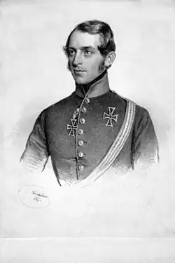 After early military service in the Bavarian Army, Stadion joined the Austrian Empire′s Cuirassier Regiment No. 1 in 1823 with the rank of leutnant (lieutenant). In 1830 he transferred at the rank of oberleutnant to become adjutant to the infantry regiment Fürst Alois Liechtenstein No. 12. In January 1834 he served in a squadron of Uhlan Regiment No. 1, where he was promoted to major in 1839. In the same year he became wing adjutant to Emperor Ferdinand I of Austria and rose in this position in 1842 to oberstleutnant (lieutenant colonel). Appointed Colonel Treasurer of the Emperor in 1845, he moved to Schwarzenberg Uhlan Regiment No. 2, where he was promoted to oberst (colonel).