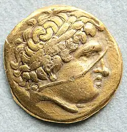 Philippeioi (Greek: Φιλίππειοι, Philíppeioi), later called Alexanders (Ἀλέξανδροι, Aléxandroi),[1] were the gold coins used in the ancient Greek Kingdom of Macedonia. First issued at some point between 355 and 347 BC,[2] the coins featured a portrait of the Greek deity Apollo on the obverse, and on the reverse, an illustration of a biga, a Greek chariot drawn by two horses.[3] They had the value of one gold stater each.[2] In the first issuing, Apollo was depicted with long hair, but after that the design was altered permanently to one in which Apollo's hair was shorter.[4]
