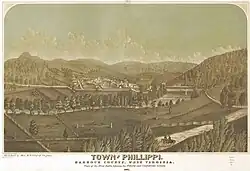 In 1825, the first post office in the region (that would later become Barbour County) was established by Henson Lewis Hoff (1805-1890), an expeditious young man who had just arrived from Loudoun County. Hoff settled at Cherry Hill, just west of the current city limits of Philippi. After Hoff became the postmaster, the community that would become Philippi was known as "Hoffsville" and remained so until 1841 when the name "Philippa" was first considered.[7][8]