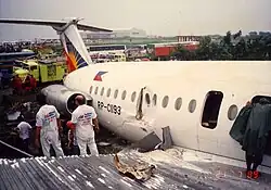 On July 21, 1989, the aircraft skidded and overran Manila's Runway 06, losing its undercarriage and ran onto a motorway, striking vehicles and killing eight people on the ground. The aircraft was written off.[1][2][3]