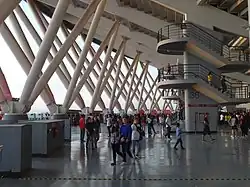 Populous, a global mega-architecture firm, designed the arena through their office in Brisbane, Australia.[17] The official website of the sports facility describe's the structure's architectural style as Modernist.[18] The arena has been master-planned to enable at least 50,000 people to gather inside the building and a further 50,000 to gather at a ‘live site’ or plaza outside to share in major events.[17] The seating bowl of the arena is a one-sided bowl and is partitioned into two parts, the upper and the lower bowl each with approximately 25,000 seating capacity. The lower bowl is the most used part of the building and the architectural design allows for easy separation of the lower bowl from the upper tier, by curtaining with acoustic and thermal properties. A retractable seating of 2,000 people capacity is also installed behind the stage which is used by the choir of the Iglesia ni Cristo for events of the church.[2]
