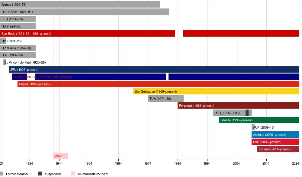 Currently, the De La Salle-College of Saint Benilde, San Beda University and Arellano University compete in all Seniors' sports, while La Salle Green Hills, San Beda College-Rizal and University of Perpetual Help System DALTA participates in all Juniors' sports.