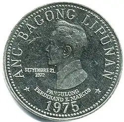 From 1975 to 1982, a five-peso coin was introduced by the Bangko Sentral ng Pilipinas (BSP) in line with the new 'Ang Bagong Lipunan' series issued in commemoration of Fedinand Marcos' declaration of Martial Law. The obverse bears the inscription 'Ang Bagong Lipunan,' year of minting, and a profile of Marcos, who was the president throughout the circulation of the coins, faced to the left. Marcos himself approved the coins with his own face. The denomination, the inscription 'Republika ng Pilipinas' and its official coat of arms, are all on the reverse. This coin rarely circulated due to its large size and since it coexisted with the 2-peso and 5-peso notes.