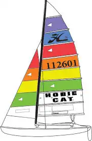 The 16 is the most popular Hobie Cat, both for recreational and racing purposes and as a one-design racer. The boat is 16'7" long, 7'11" wide, and has a mast 26'6" tall, but only weighs 320 pounds. As with the 14, it is intended to be sailed from the beach through the surf, and to be surfed back in on the waves to the beach. Instead of daggerboards or centreboards, the 16 has asymmetrical hulls which act like foils and keep the boat from crabbing, or slipping sideways from the force of the wind. Both jib and main sails are fully battened and total 218 square feet (20 m2). A trapeze is usually used by the crew and helmsman.