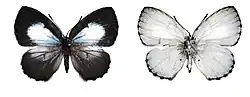 The species name refers to the extraordinary colouration of the male upperside and overall divergent morphology of this species and is derived from radicala.[2]