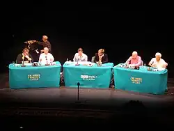 Phillip Christopher Jupitus (/ˈdʒuːpɪtəs/, né Swan; born 25 June 1962)[2] is a retired English stand-up and improv comedian, actor, performance poet, cartoonist and podcaster. Jupitus was a team captain on all but one BBC Two-broadcast episode of music quiz Never Mind the Buzzcocks from its inception in 1996 until 2015, and also appeared regularly as a guest on several other panel shows, including QI and BBC Radio 4's I'm Sorry I Haven't a Clue.