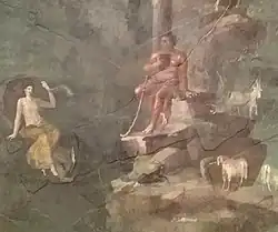 There were contradictory ancient accounts concerning Philoxenus' inspiration for the poem.[23] According to a Scholiast on Theocritus' Idyll 6, the historian Duris (c. 340–c. 260 BC) said that there was a shrine to Galatea near Mount Etna built by Polyphemus, and that when Philoxenus visited the shrine and could think of no reason for it, he invented the story of Polyphemus' love for Galatea.[24] However, in what is probably the earliest account, that of Phaenias', by way of Athenaes, Philoxenus' Cyclops was written, while the poet was imprisoned in the quarries, as a court satire, where, in the manner of a Roman à clef, the characters in Philoxenus' dithyramb: Polyphemus, Odysseus and the sea nymph Galatea, were meant to represent Dionysius, Philoxenus, and Dionysius' mistress, the aulos-player Galatea, respectively.[25]