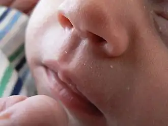 The philtrum (Latin: philtrum, from Ancient Greek φίλτρον phíltron, lit. 'love charm'[2]) or medial cleft is a vertical indentation in the middle area of the upper lip, common to therian mammals, extending in humans from the nasal septum to the tubercle of the upper lip. Together with a glandular rhinarium and slit-like nostrils, it is believed to constitute the primitive condition for at least therian mammals. Monotremes lack a philtrum, though this could be due to the specialised, beak-like jaws in living species.[3]