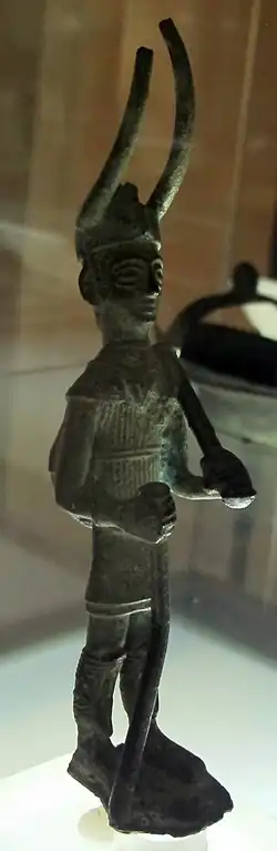 Nuragic art and religious rituals during Phoenician contact show a mix of cultural traditions, the bronze statuettes at that time adopted Middle Eastern-style oranti style, which was similar to Phoenician religious statues. These hybrid artworks found at sites such as Santa Cristina (Paulilatino) have retained both the Nuragic geometric patterns with Phoenician details like almond-shaped eyes and draped clothing.