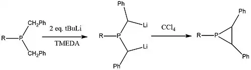 Tertiary dibenzylphosphine is treated with 2 equivalents of tert-butyllithium with tetramethylethylenediamine to generate the dilithium intermediate which cyclizes to phosphirane upon addition of carbon tetrachloride,[6]