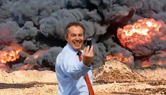 Photo Op is a 2005 photomontage of the British Prime Minister Tony Blair taking a selfie against a backdrop of burning oil. It was created by the collaborative kennardphillipps, consisting of the artists Peter Kennard and Cat Phillipps.