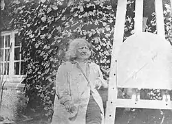 Its status in the history of Danish photography is rivalled by a portrait of Bertel Thorvaldsen sitting at an easel outside his studio in the garden of the Royal Danish Academy of Fine Arts at Charlottenborg Palace in Copenhagen. This daguerrotype was taken by the French photographer Aymard Charles Théodore Neubourg, who visited Copenhagen in the summer of 1840. An examination of the circumstances under which it was taken reveals that the date was Sunday, 26 July 1840.[9] It has also been noticed that Thorvaldsen is making the horn sign with what apparently is his left hand although, as a result of the daguerrotype mirror effect, it is actually his right hand. This has been ascribed to the anxiety he must have experienced while facing the new mechanical device which could reveal even the slightest detail.[10][11]