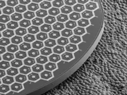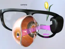 Photovoltaic retinal prosthesis is a technology for restoration of sight to patients blinded by degenerative retinal diseases, such as retinitis pigmentosa and age-related macular degeneration (AMD), when patients lose the 'image capturing' photoreceptors, but neurons in the 'image-processing' inner retinal layers are relatively well-preserved.[1] This subretinal prosthesis is designed to restore sight by electrically stimulating the surviving inner retinal neurons, primarily the bipolar cells. Photovoltaic retinal implants are completely wireless and powered by near-infrared illumination (880 nm) projected from the augmented-reality glasses. Lack of trans-scleral cable greatly simplifies the implantation procedure compared to other retinal implants.[2] Optical activation of the photovoltaic pixels allows scaling the implants to thousands of electrodes and retains natural coupling of the eye movements to visual perception. Studies in rats with retinal degeneration demonstrated that prosthetic vision with such subretinal implants preserves many features of natural vision, including flicker fusion at high frequencies (>20 Hz), adaptation to static images, antagonistic center-surround organization and non-linear summation of subunits in receptive fields, providing high spatial resolution.[3]