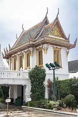 To the southeast is the Phra Thinang Racharuedee (พระที่นั่งราชฤดี; RTGS: Phra Thi Nang Ratcha Ruedi), a Thai-style pavilion constructed during the reign of King Rama VI as an outdoor audience chamber.[48] The pavilion was constructed for use especially during the birthday celebrations of the king. Originally King Rama IV had a two-story, European-style building constructed. Its purpose was to display gifts from foreign nations; however when this building became dilapidated King Rama V replaced it with a Chinese-style pavilion which was again dismantled and rebuilt. The present pavilion measures 12 by 7.80 metres (39.4 ft × 25.6 ft). The pediments are decorated with a gilded figures of Narayana on a garuda against a white mosaic background.[49][50]
