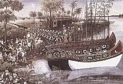 Various sources give differing accounts of how cannons came to be made in Pattani and who made them.[2][3] According to Sejarah Kerajaan Melayu Patani ("History of the Malay Kingdom of Patani"), cannons were cast in the early-17th century in the Sultanate of Pattani by a man of Chinese descent named Tok Kayan. Raja Biru ordered the construction of powerful artillery to protect their independence from Siam.[4] Three cannons were made – two siege guns named Seri Negara, Seri Patani, and a smaller cannon named the Maha Lela.[5] Phongsawadan muang pattani ("Chronicle of Pattani") named the cannons as Cri Nagri, Nang Pattani, and Maha Lalo.[6] Hikayat Patani, however, gives the name of these three cannons as Seri Negeri, Tuk (Datuk) Buk, and Nang (Lady) Liu-Liu. It suggests that the first cannon was cast earlier by a man from Rum (Istanbul) called Abdussamad, but it was too thin to be usable, only later through the powers (daulat) of Patani's first king were the three cannons cast.[1][7] While it is unclear who created the cannons, a large cannon was known to have existed by the early 17th century in Patani; a Dutch report mentioned in 1602 that a cannon "bigger than any found in Amsterdam" was placed prominently near the port of Patani.[8] The cannons were said to have successfully repelled a number of attacks.