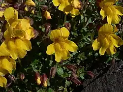 About 16 species are in cultivation.[3] They are known horticulturally as "Mimulus" and were formerly placed in the genus Mimulus when it was defined broadly to include about 150 species. Mimulus, as a botanical name, rather than a common name or horticultural name, now represents a genus of only seven species. Most of its former species have been transferred to Diplacus or Erythranthe.[2] Six of the horticultural species are of special importance. These are Diplacus aurantiacus, Diplacus puniceus, Erythranthe cardinalis, Erythranthe guttata, Erythranthe lutea, and Erythranthe cuprea.