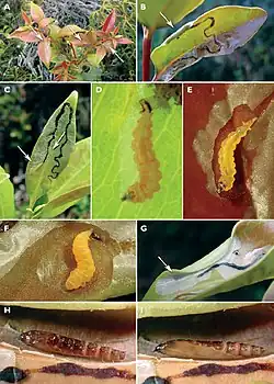 A Leaf mines of young growing Gaiadendron shoot B mature mine with pupal cocoon fold (arrow) C nearly mature mine and mature sap-feeding larva (left arrow), and oviposition location (right arrow) D close-up view of mature sap-feeding larva E openede mine showing mature sap-feeding larva in situ F opened young pupal cocoon fold showing cocoon-spinning larva in situ G pupal cocoon fold, arrow pointing at thinner pupal exit H opened pupal cocoon fold showing pupa in situ, dorsal view I pupa in situ, lateral view.