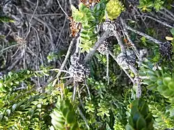 Phymatocarpus porphyrocephalus is an erect to spreading shrub which sometimes grows to a height and width of 2 metres (7 ft). The leaves are arranged alternately and are 4–6 millimetres (0.16–0.24 in) long. They are broad elliptic to egg-shaped with the narrow end towards the base, sometimes almost circular and have 1 to 3 veins.[1][2][3]