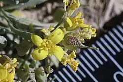 Physaria pulvinata is a flowering plant species in the family Brassicaceae known by the common name cushion bladderpod. It is a rare species endemic to the Mancos Shale Barrens of Dolores and San Miguel counties in southwest Colorado.[2] Described by Steve O'Kane and James L. Reveal in 2006, this plant grows in dense mats with yellow flowers, gray stellate hairs, and ellipsoid fruits.[3] This plant is considered a sensitive species and faces many threats including grazing, road construction, shale mining, invasive species and climate change.[4]