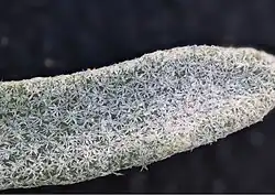 Physaria pulvinata is a compact plant which grows close to the ground in dense mats.[2] The plant is heavily covered with stellate hairs causing it to appear gray-green in color.[3] Flowers are yellow with four spatulate petals each around 4–7 mm in length. Fruits are pubescent, compressed, ellipsoid and 4–6 mm in length.[4] It is a long lived perennial plant with reddish stems and a deep taproot.[2] P. pulvinata is less than 30 cm across and forms a densely branching system of several hundred stalks each with clusters of narrow entire-margined leaves.[4]