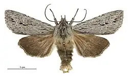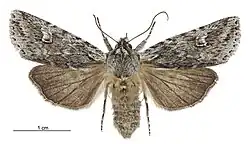 ♂, 31 mm.; ♀, 34 mm. Head and thorax grey, strongly crested. Antennae filiform. Abdomen ochreous grey, crests slight. Forewings bright grey, irrorated with fuscous. A jagged subbasal line, strongly marked on submedian fold, where it turns abruptly towards base. A dark line across wing at 1⁄3, double, space between double lines grey (not irrorated), a dark mark on costa at 1⁄2, followed by two more above reniform. Subterminal line faint and suffused. A terminal series of black points; a few dark points outline veins. Orbicular faint, but with a well-defined line along lower edge. Reniform defined by a dark line below and on terminal edge. Cilia grey, mixed with fuscous. Hind -wings brown, darker towards termen. Cilia brown, with fine paler line at base. Tips grey-white.[3]