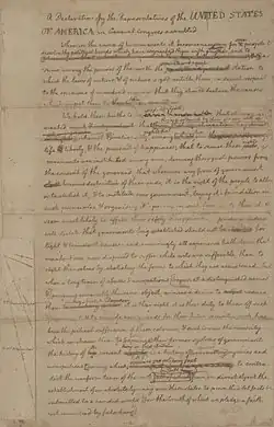 The earliest known draft of the Declaration of Independence is a fragment known as the "Composition Draft".[1] The draft, written in July 1776, is in the handwriting of Thomas Jefferson, principal author of the Declaration. It was discovered in 1947 by historian Julian P. Boyd in the Jefferson papers at the Library of Congress. Boyd was examining primary documents for publication in The Papers of Thomas Jefferson when he found the document, a piece of paper that contains a small part of the text of the Declaration, as well as some unrelated notes made by Jefferson.[2] Prior to Boyd's discovery, the only known draft of the Declaration had been a document known as the Rough Draft. The discovery confirmed speculation by historians that Jefferson must have written more than one draft of the text.[2]