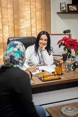 A doctor's visit, also known as a physician office visit or a consultation, or a ward round in an inpatient care context, is a meeting between a patient with a physician to get health advice or treatment plan for a symptom or condition, most often at a professional health facility such as a doctor's office, clinic or hospital. According to a survey in the United States, a physician typically sees between 50 and 100 patients per week, but it may vary with medical specialty, but differs only little by community size such as metropolitan versus rural areas.[1]
