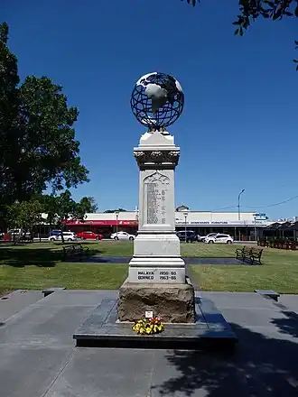 The use of the land around the cenotaph and memorial hall has changed over time. The last passenger service ran to Pialba station in 1972; the railway reserve was progressively subdivided from 1990; and train services were withdrawn from Pialba in January 1994.[22][23] The station master's house faced the sea at the north end of the yard (now the northwest corner of Freedom Park) until its removal c.1999.[24] By late 1998 the cenotaph had been moved 30 metres (98 ft) west, as Railway Square was landscaped as part of Freedom Park, which in 2016 covered 0.82 hectares (2.0 acres) of the former railway reserve, including the former railway station building and the memorial hall.[25][26] The railway station building was also moved westwards, and was rotated 180° to face the cenotaph, which was rededicated on 6 January 1999. A hollow metal world globe with laurel leaves at its base, designed and built by George Pujol, was added to the top of the marble pillar at this time.[1]